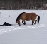 雪に寝ころがる人間を見て…マネする馬がカワイイ!(動画)