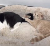 しっぽで遊んでいた猫「がぶっ」…もう1匹の猫に怒られてしまう(動画)