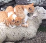 猫3匹が羊の上でスヤスヤ…1匹はマッサージ(動画)