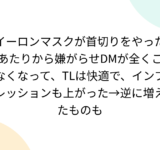 イーロンマスクが首切りをやったあたりから嫌がらせDMが全くこなくなって、TLは快適で、インプレッションも上がった→逆に増えたものも