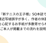 『新テニスの王子様』SQ本誌で最近写植誤字が多く、作者の体調を心配するお手紙が多数寄せられご本人が掲載までの流れを説明