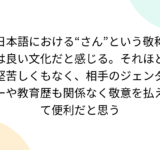 日本語における“さん”という敬称は良い文化だと感じる。それほど堅苦しくもなく、相手のジェンダーや教育歴も関係なく敬意を払えて便利だと思う