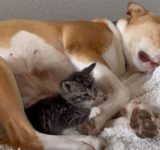 優しい犬のママが3匹の子猫たち見守る(動画)