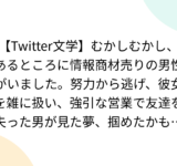 【Twitter文学】むかしむかし、あるところに情報商材売りの男性がいました。努力から逃げ、彼女を雑に扱い、強引な営業で友達を失った男が見た夢、掴めたかもしれない幸せ、東京での20年は何だったのか…