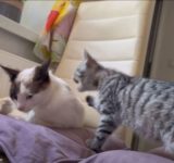 子猫とお兄ちゃん猫の…かわいい戦い(動画)