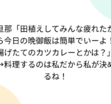 旦那「田植えしてみんな疲れたから今日の晩御飯は簡単でいーよ!揚げたてのカツカレーとかは?」→料理するのは私だから私が決めるね!