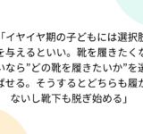 「イヤイヤ期の子どもには選択肢を与えるといい。靴を履きたくないなら”どの靴を履きたいか”を選ばせる。そうするとどちらも履かないし靴下も脱ぎ始める」