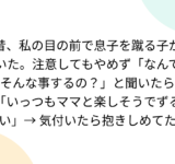 昔、私の目の前で息子を蹴る子がいた。注意してもやめず「なんでそんな事するの?」と聞いたら「いっつもママと楽しそうでずるい」→ 気付いたら抱きしめてた