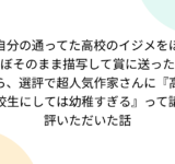自分の通ってた高校のイジメをほぼそのまま描写して賞に送ったら、選評で超人気作家さんに『高校生にしては幼稚すぎる』って講評いただいた話