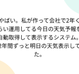 やばい。私が作って会社で2年くらい運用してる今日の天気予報を自動取得して表示するシステム。2年間ずっと明日の天気表示してた。