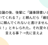 会議の後、後輩に「議事録書いといてくれる?」と頼んだら「最初に頼んでくれないと書けませんよ!」とキレられた。それ堂々と言える事?→先に言えよ