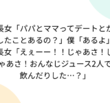 長女「パパとママってデートとかしたことあるの?」僕「あるよ」長女「えぇーー!!じゃあさ!じゃあさ!おんなじジュース2人で飲んだりした…?」