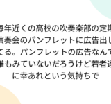 毎年近くの高校の吹奏楽部の定期演奏会のパンフレットに広告出してる。パンフレットの広告なんて誰もみていないだろうけど若者達に幸あれという気持ちで