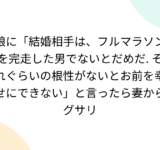 娘に「結婚相手は、フルマラソンを完走した男でないとだめだ. それぐらいの根性がないとお前を幸せにできない」と言ったら妻からグサリ