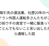 取引先の運送業、社歴20年のベテラン外国人運転手さんたちがこの前ウチの食堂で一緒に飯食っててとんでもないこと言い出したから通報した話
