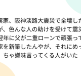 実家、阪神淡路大震災で全壊したが、色んな人の助けを受けて震災翌年に父が二重ローンで頑張って家を新築したんやが、それにめっちゃ嫌味言ってくる人がいた