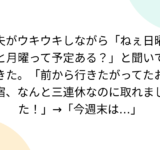 夫がウキウキしながら「ねぇ日曜と月曜って予定ある?」と聞いてきた。「前から行きたがってたお宿、なんと三連休なのに取れました!」→「今週末は…」