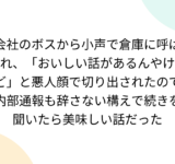 会社のボスから小声で倉庫に呼ばれ、「おいしい話があるんやけど」と悪人顔で切り出されたので内部通報も辞さない構えで続きを聞いたら美味しい話だった
