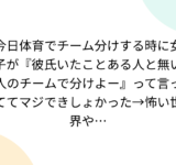 今日体育でチーム分けする時に女子が『彼氏いたことある人と無い人のチームで分けよー』って言っててマジできしょかった→怖い世界や…