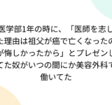 医学部1年の時に、「医師を志した理由は祖父が癌で亡くなったのが悔しかったから」とプレゼンしてた奴がいつの間にか美容外科で働いてた