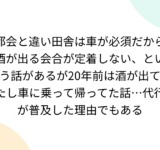 都会と違い田舎は車が必須だから酒が出る会合が定着しない、という話があるが20年前は酒が出てたし車に乗って帰ってた話…代行が普及した理由でもある