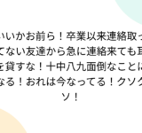 いいかお前ら!卒業以来連絡取ってない友達から急に連絡来ても耳を貸すな!十中八九面倒なことになる!おれは今なってる!クソクソ!
