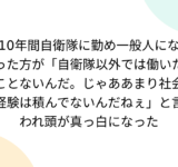 10年間自衛隊に勤め一般人になった方が「自衛隊以外では働いたことないんだ。じゃああまり社会経験は積んでないんだねぇ」と言われ頭が真っ白になった