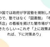 中国では政府が学習塾を規制したので、塾ではなく「図書館」「喫茶店」の看板を掲げた闇市場ができたらしい→これぞ「上に政策あれば、下に対策あり」