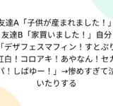 友達A「子供が産まれました!」友達B「家買いました!」自分「デザフェスマフィン!すとぷり紅白!コロアキ!あやなん!セカパ!しばゆー!」→惨めすぎて泣いたりする