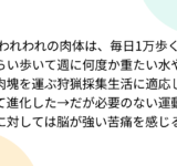 われわれの肉体は、毎日1万歩くらい歩いて週に何度か重たい水や肉塊を運ぶ狩猟採集生活に適応して進化した→だが必要のない運動に対しては脳が強い苦痛を感じる