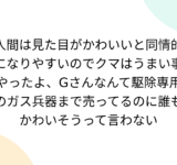 人間は見た目がかわいいと同情的になりやすいのでクマはうまい事やったよ、Gさんなんて駆除専用のガス兵器まで売ってるのに誰もかわいそうって言わない