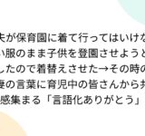 夫が保育園に着て行ってはいけない服のまま子供を登園させようとしたので着替えさせた→その時の妻の言葉に育児中の皆さんから共感集まる「言語化ありがとう」