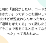 上司に「開発がしたい、コードが書きたい」ってずっとお願いしてたけど状況変わらんかったから「退職を考えてる」って話したら「そこまで考えてると思ってなかった」って言われた…