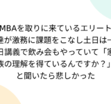 MBAを取りに来ているエリート達が激務に課題をこなし土日は一日講義で飲み会もやっていて「家族の理解を得ているんですか?」と聞いたら悲しかった