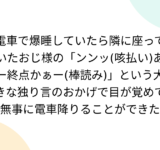 電車で爆睡していたら隣に座っていたおじ様の「ンンッ(咳払い)あー終点かぁー(棒読み)」という大きな独り言のおかげで目が覚めて無事に電車降りることができた