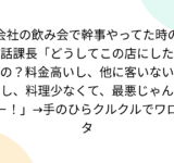 会社の飲み会で幹事やってた時の話課長「どうしてこの店にしたの?料金高いし、他に客いないし、料理少なくて、最悪じゃん-!」→手のひらクルクルでワロタ
