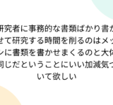 研究者に事務的な書類ばかり書かせて研究する時間を削るのはメッシに書類を書かせまくるのと大体同じだということにいい加減気づいて欲しい
