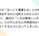父が「ゆっくり霊夢だぜ」とか物真似するのには耐えられたんだけど、最近は「これは美味しいのだ」とかずんだもんの物真似までよくするようになってしまった。