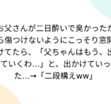 お父さんが二日酔いで臭かったから傷つけないようにこっそり窓開けてたら、「父ちゃんはもう、出ていくわ…」と、出かけていった…→「二段構えww」