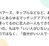 ペアーズ、タップルなどなど、ありとあらゆるマッチングアプリを使ってるのに恋人の一人もできないの、もはや「いい人がいない」のではなく、「自分がいい人ではない」説→「不都合な真実」
