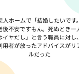 老人ホームで「結婚したいです。老後不安ですもん。死ぬとき一人はイヤだし」と言う職員に対し、利用者が放ったアドバイスがリアルだった