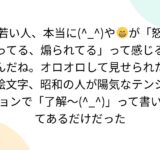 若い人、本当に(^_^)や😁が「怒ってる、煽られてる」って感じるんだね。オロオロして見せられた絵文字、昭和の人が陽気なテンションで「了解〜(^_^)」って書いてあるだけだった
