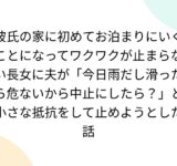 彼氏の家に初めてお泊まりにいくことになってワクワクが止まらない長女に夫が「今日雨だし滑ったら危ないから中止にしたら?」と小さな抵抗をして止めようとした話