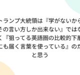 トランプ大統領は『学がないからその言い方しか出来ない』ではなく『狙ってる英語圏の比較的下層にも届く言葉を使っている』のだと思う