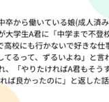 中卒から働いている娘(成人済み)が大学生A君に「中学まで不登校で高校にも行かないで好きな仕事してるって、ずるいよね」と言われ、「やりたければA君もそうすれば良かったのに」と返した話