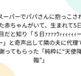 スーパーでパパさんに抱っこされた赤ちゃんがいて、生まれて5日目だと知り「5日ァァァァウィィィィィィーー」と奇声出して隣の夫に代理で謝ってもらった「純粋に“天使降臨”」