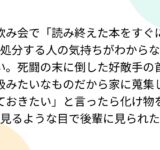 飲み会で「読み終えた本をすぐに処分する人の気持ちがわからない。死闘の末に倒した好敵手の首級みたいなものだから家に蒐集しておきたい」と言ったら化け物を見るような目で後輩に見られた