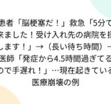 患者「脳梗塞だ!」救急「5分で来ました!受け入れ先の病院を探します!」→(長い待ち時間)→医師「発症から4.5時間過ぎてるので手遅れ!」…現在起きている医療崩壊の例