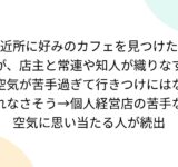 近所に好みのカフェを見つけたが、店主と常連や知人が織りなす空気が苦手過ぎて行きつけにはなれなさそう→個人経営店の苦手な空気に思い当たる人が続出