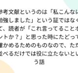 参考文献というのは「私こんなに勉強しました」という証ではなくて、読者が「これ言ってることホントか?」と思った時にたどって確かめるためのものなので、ただ並べるだけでは役に立たないという話